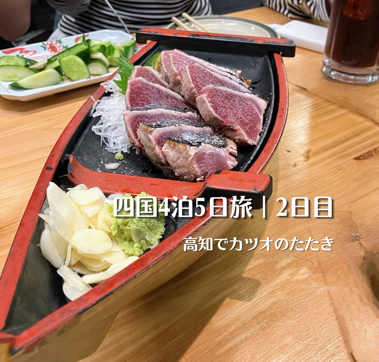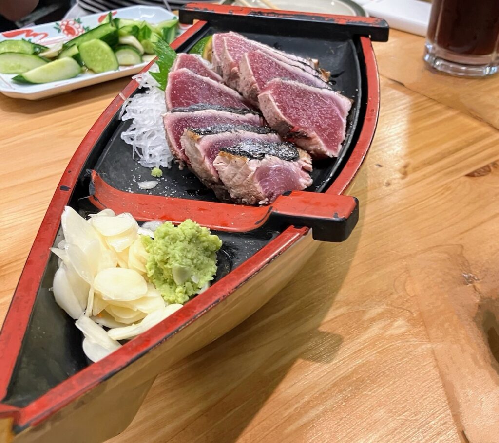 - 初めての本場のカツオ: 分厚いカツオにスライスしたニンニクを添えて……。